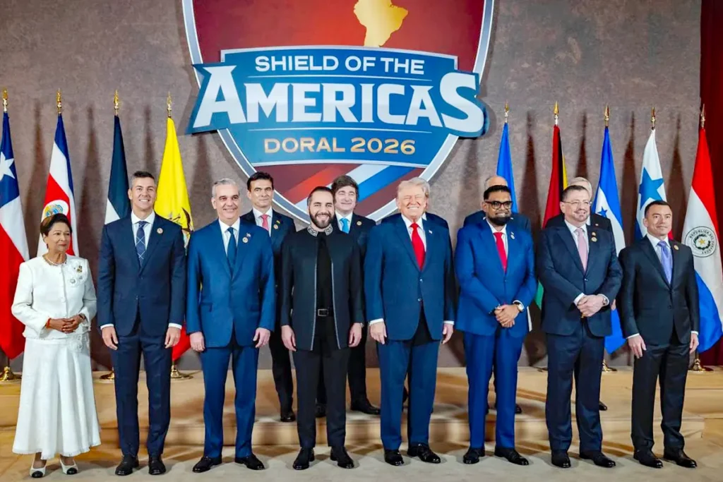 Los líderes presentes: La cumbre reunió a una docena de mandatarios latinoamericanos considerados aliados de Washington: Javier Milei (Argentina), Rodrigo Chaves Robles (Costa Rica), Luis Abinader (República Dominicana), Daniel Noboa (Ecuador), Nayib Bukele (El Salvador), Nasry Asfura (Honduras), José Raúl Mulino (Panamá), Santiago Peña (Paraguay), José Antonio Kast (Chile, presidente electo) y Kamla Persad-Bissessar (Trinidad y Tobago).