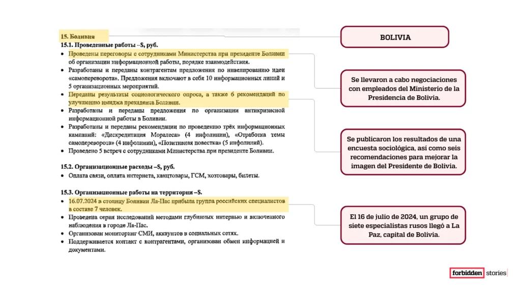 - En octubre de 2024, la “Compañía” pidió autorización para abrir una “oficina de información” en Bolivia dedicada a campañas locales, con un gerente, un traductor y 20 empleados “extranjeros”, con inicio previsto para noviembre de ese año.