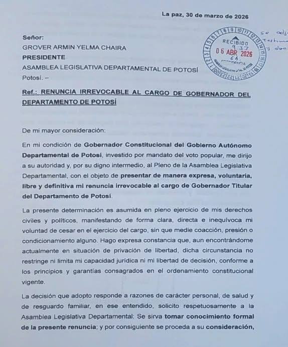 Lo esencial: Jhonny Mamani, gobernador de Potosí, presentó su renuncia irrevocable desde la cárcel, alegando motivos personales, de salud y familiares. La Asamblea Legislativa Departamental (ALD) debe nombrar un gobernador interino para garantizar la continuidad administrativa hasta el 3 de mayo, fin del periodo constitucional.