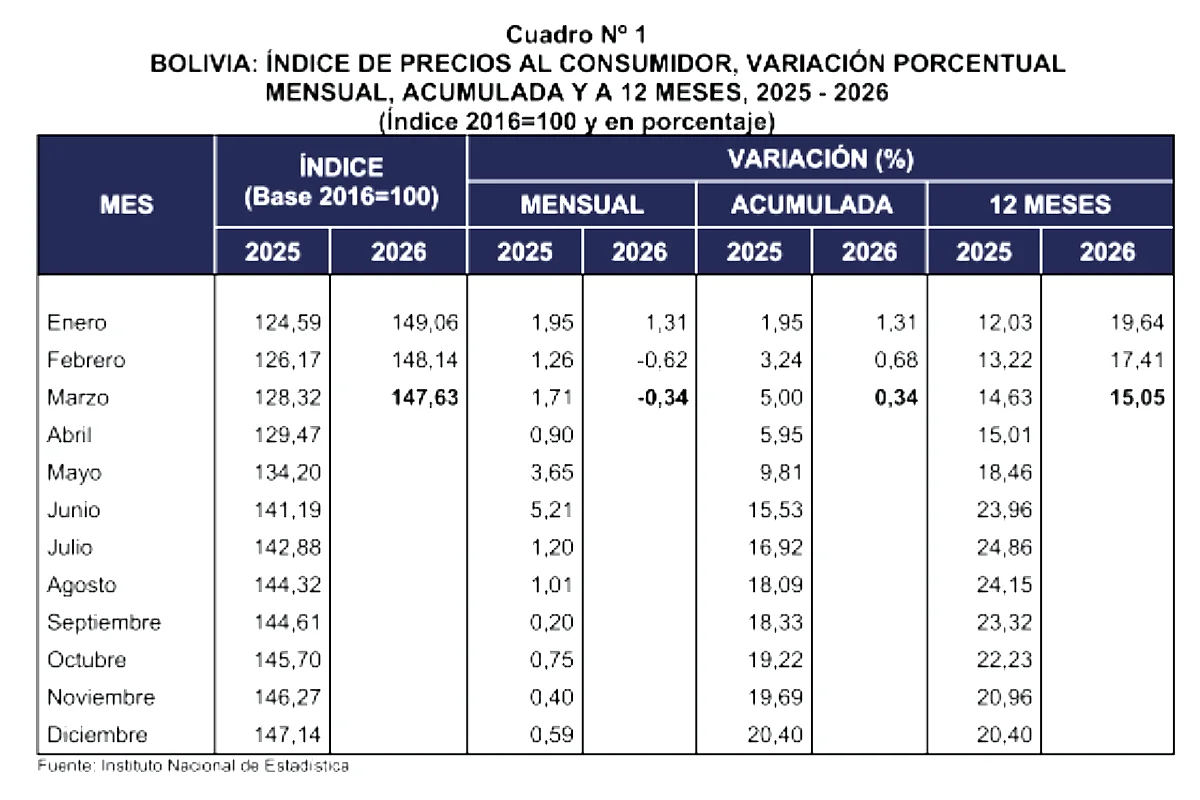 Lo esencial: El INE informó que la inflación acumulada en Bolivia hasta marzo de 2026 llegó a 0,34%, en un contexto de dos meses seguidos con variación negativa de precios, tras febrero que presentó -0,68%. La caída se debió principalmente a la baja en precios de alimentos y transporte interdepartamental.
