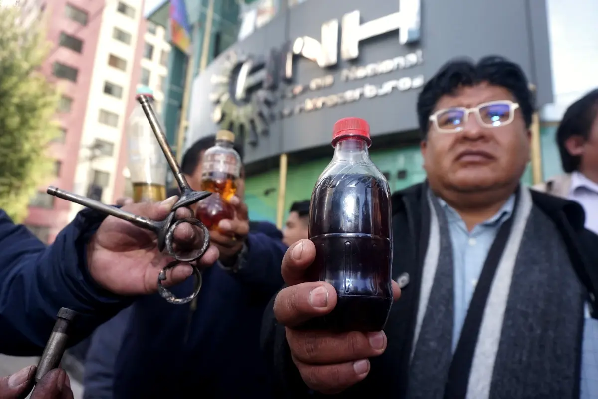 Choferes en La Paz, frente a la ANH, muestran la gasolina y los efectos en los motores. | Foto: APG