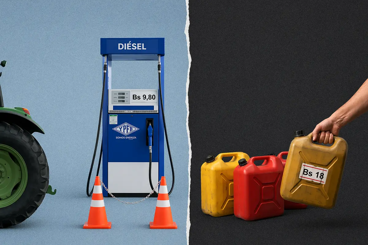 Lo esencial: La escasez de diésel en Bolivia ha reactivado el mercado negro del carburante, donde productores agropecuarios pagan hasta Bs 18 por litro para evitar la paralización de la cosecha de verano, la siembra de invierno y la preparación de la zafra cañera.